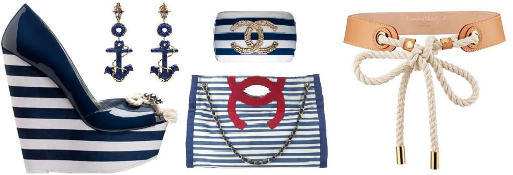 Azul marinho, branco e vermelho são as principais cores dessa tendência, e as listras ditam o estilo marinheiro junto com o dourado que prevalece em acessórios e botões.