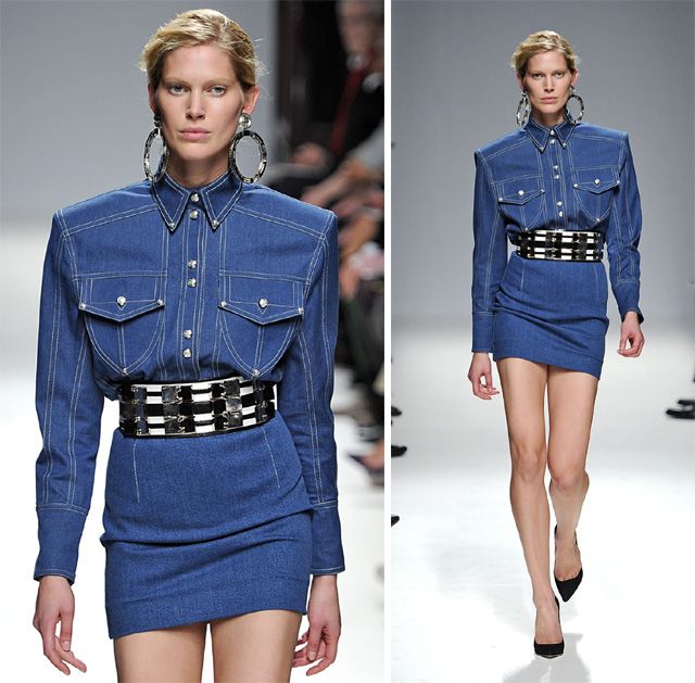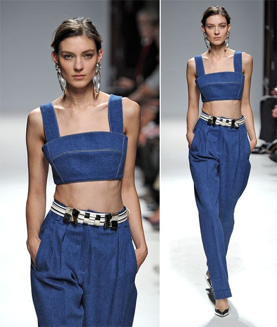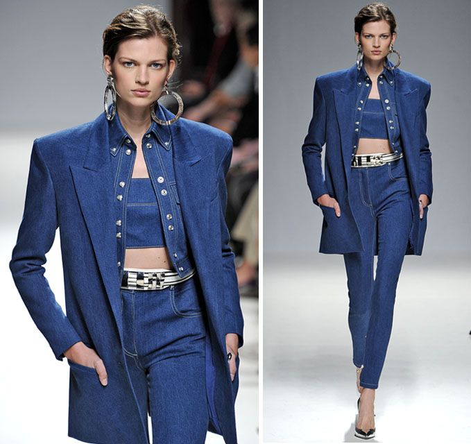 Para Olivier Rousteing, Balmain, o jeans veio acompanhado ainda da sensação do último verão, e que não foi embora, a cropped (fotos acima) - famosa barriguinha de fora. Sua coleção também conta com o 'total jeans', em lavagem vintage remetendo à década através das ombreiras largas e brincos usados no desfile e claro, sem esquecer da silhueta marcada (foto abaixo).